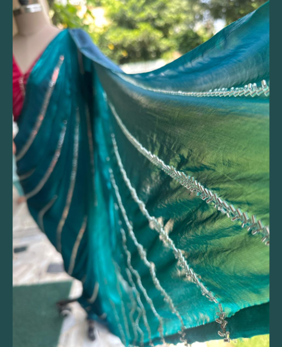 Step into timeless grace with our Azure Whisper Saree, crafted from premium glass organza that flows effortlessly with every movement. The saree is adorned with intricate thread and sequin detailing that adds a subtle shimmer, perfect for festive soirées and elegant gatherings.