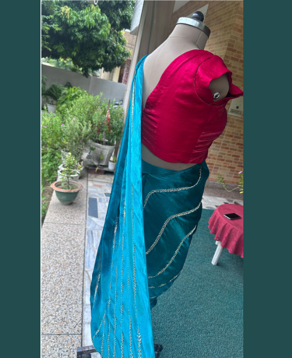 Paired with a statement butterfly blouse in matching tones and delicate cap sleeves, this ensemble blends modern charm with traditional sophistication — an exquisite choice for any special occasion.
