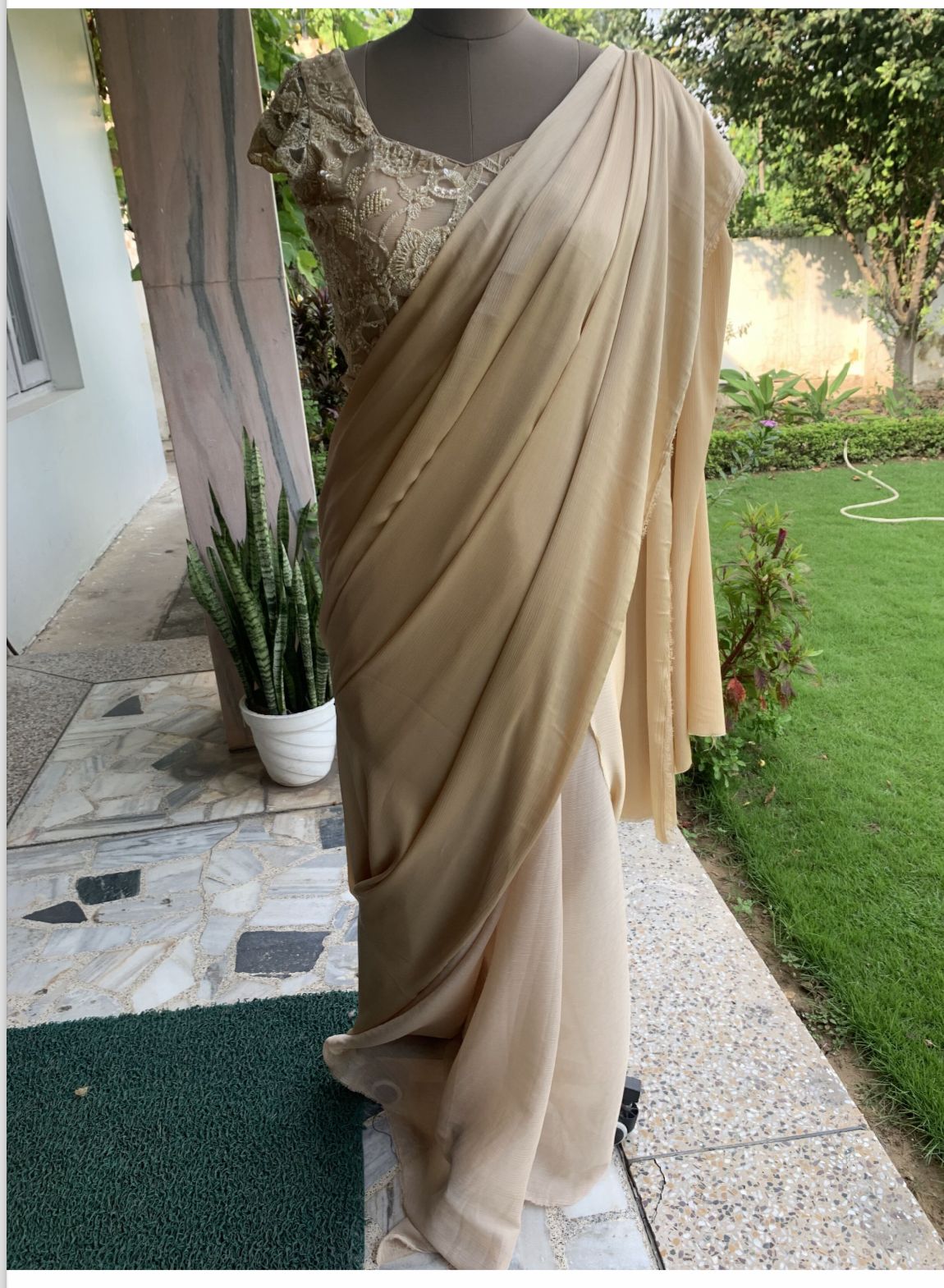 Ethereal Drape Saree in Champagne Mist, crafted in a soft, flowy fabric that drapes gracefully to enhance every silhouette. The saree is paired with an intricately embroidered blouse featuring delicate floral motifs, adding a touch of regal charm.