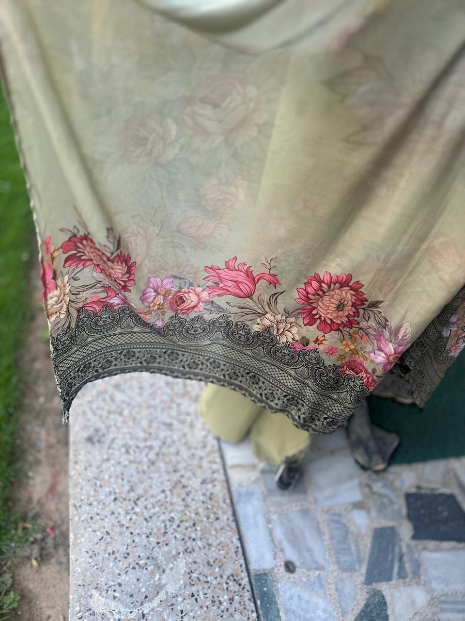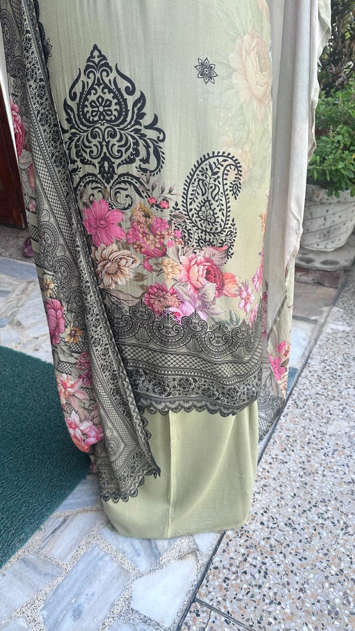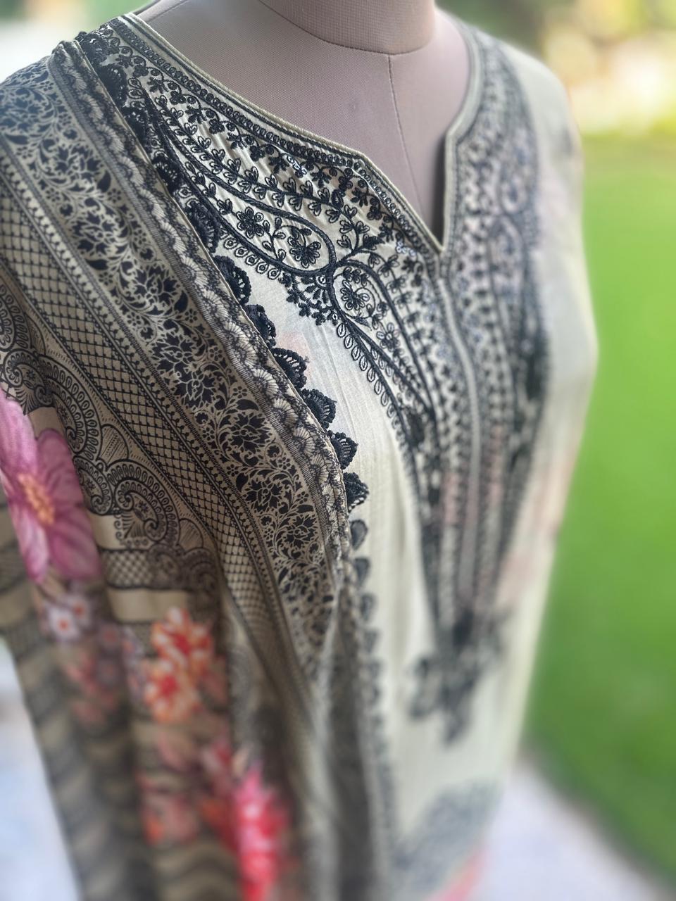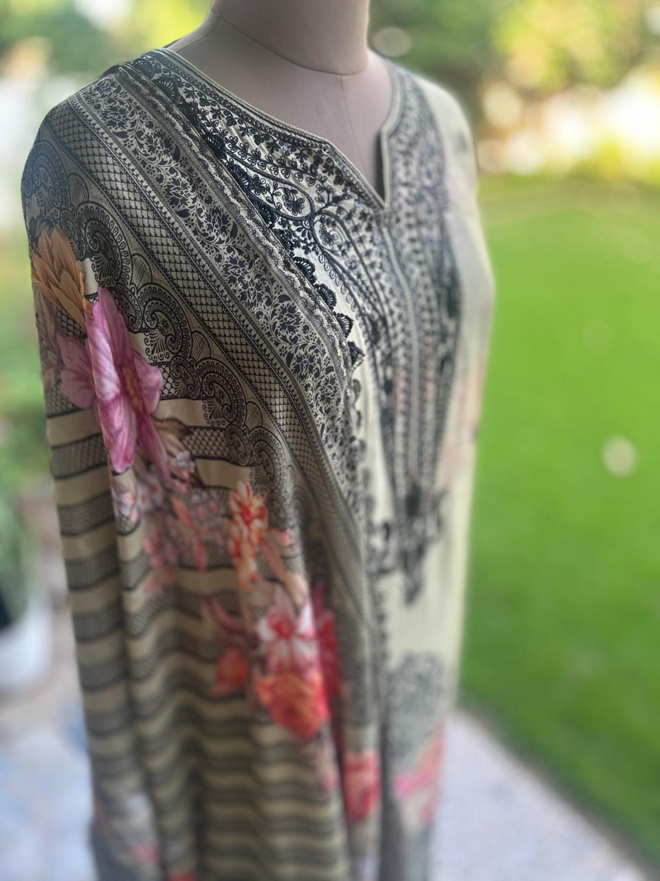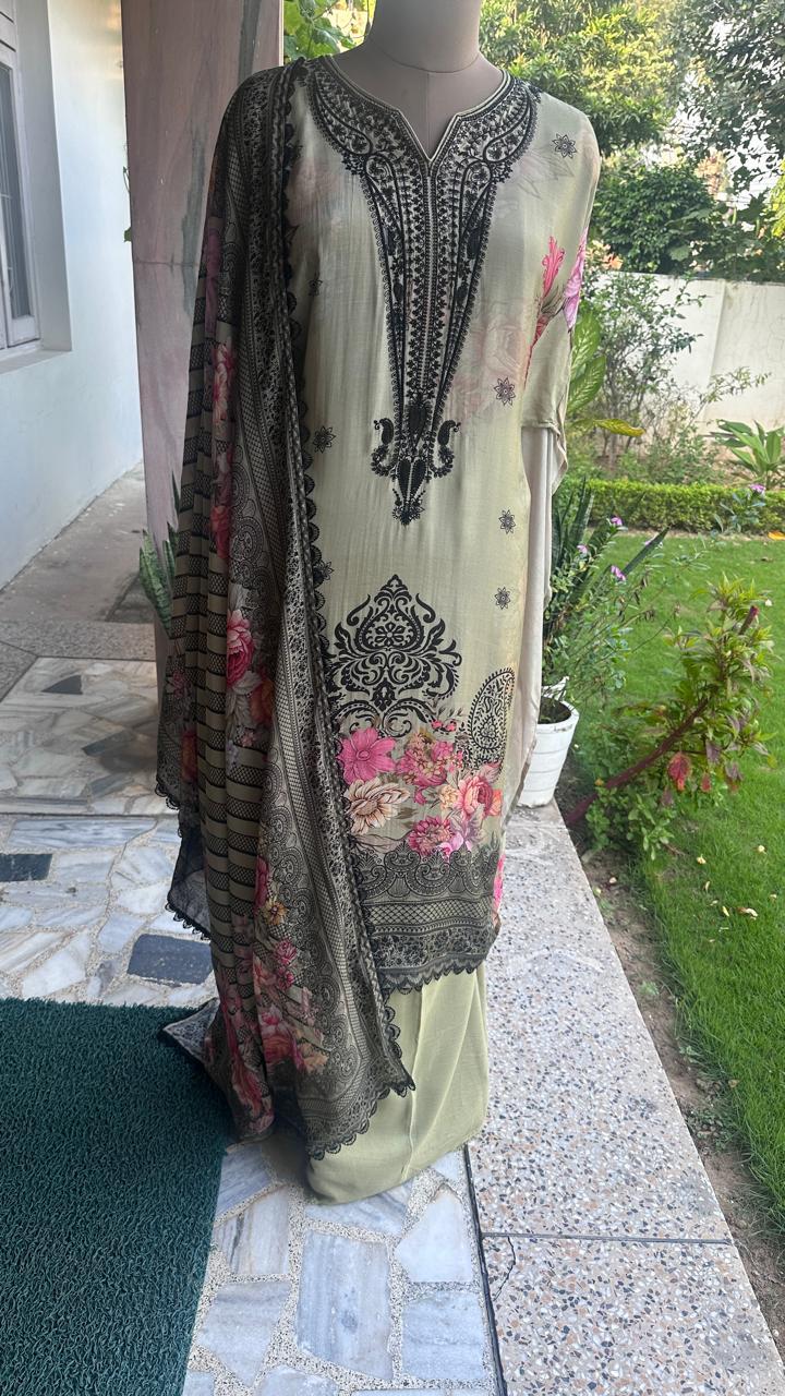 Step into sophistication with this grey semi-stitched suit set featuring a floral printed kurta with black embroidery, a plain matching bottom, and a coordinating floral dupatta. Designed for comfort and style, this outfit is perfect for festive gatherings, parties, and semi-formal occasions.