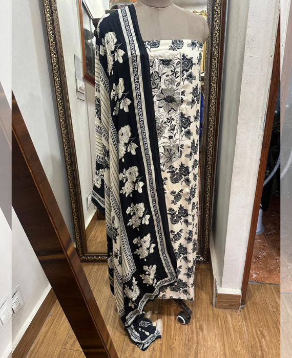 Ivory Black Floral Pashmina Winter Suit Set