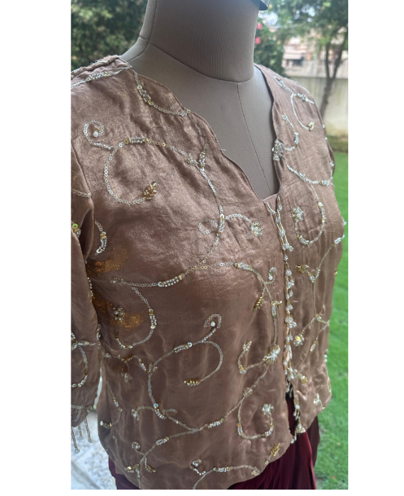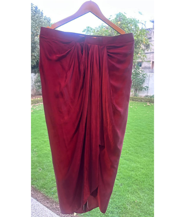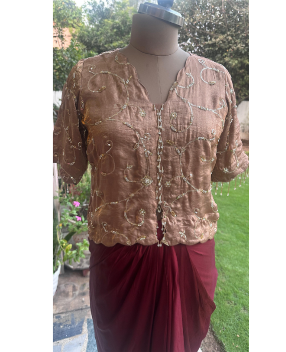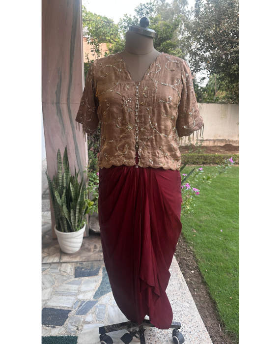 | Elevate your festive style with this designer short shirt and dhoti skirt set. The shirt, crafted in pure satin, comes in an earthy golden-brown tone adorned with delicate zardozi embroidery and applique work, further enhanced with beaded tassel details on the sleeves. Paired with a rich maroon dhoti skirt in pure modal satin (length 38”), the outfit drapes gracefully, combining comfort with royal elegance. An ideal choice for weddings, festive gatherings, and cocktail evenings. |