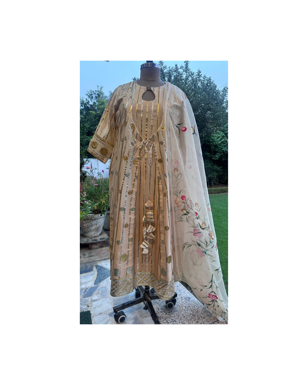 This graceful ensemble features a soft ivory base adorned with intricate gold and silver gota work, lending a regal shimmer to the kurta. The keyhole neckline is highlighted with delicate embellishments, while the front tie-up tassels add a charming detail. The set is beautifully completed with a sheer dupatta, hand-painted with floral motifs, making it a true statement of elegance and artistry. Ideal for festive occasions, intimate gatherings, and cultural celebrations, this outfit strikes a balance between tradition and sophistication.
