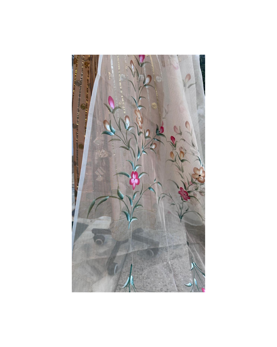 An ethereal ivory kurta with gold and silver gota detailing, paired with a sheer hand-painted dupatta — a perfect blend of timeless craftsmanship and artistic finesse.