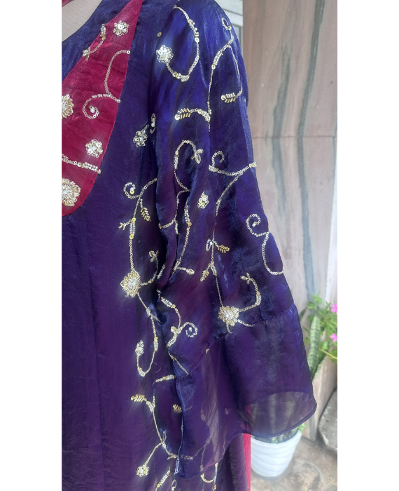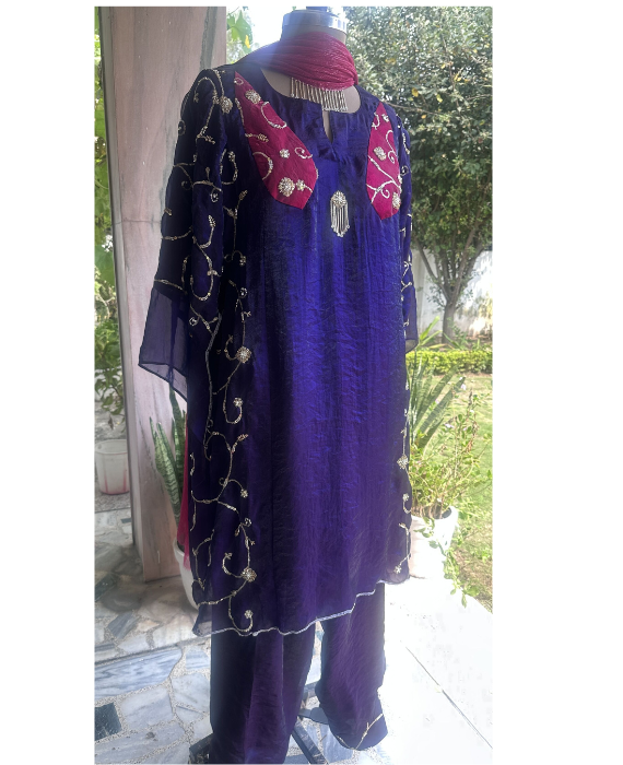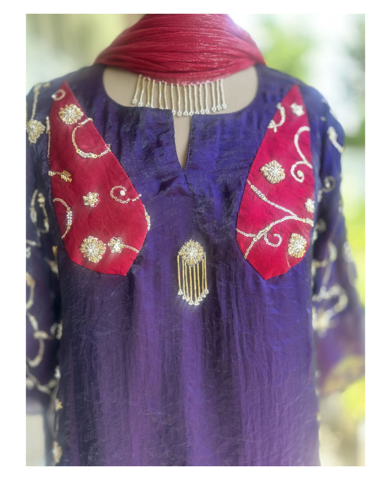 | Crafted from premium glass organza, this royal blue suit is designed to stand out. The contrasting red embroidered neckline adds a pop of color, while golden embellishments on the sleeves elevate its elegance. Paired with matching trousers, this outfit blends tradition with modern sophistication—ideal for weddings, parties, and festive gatherings.