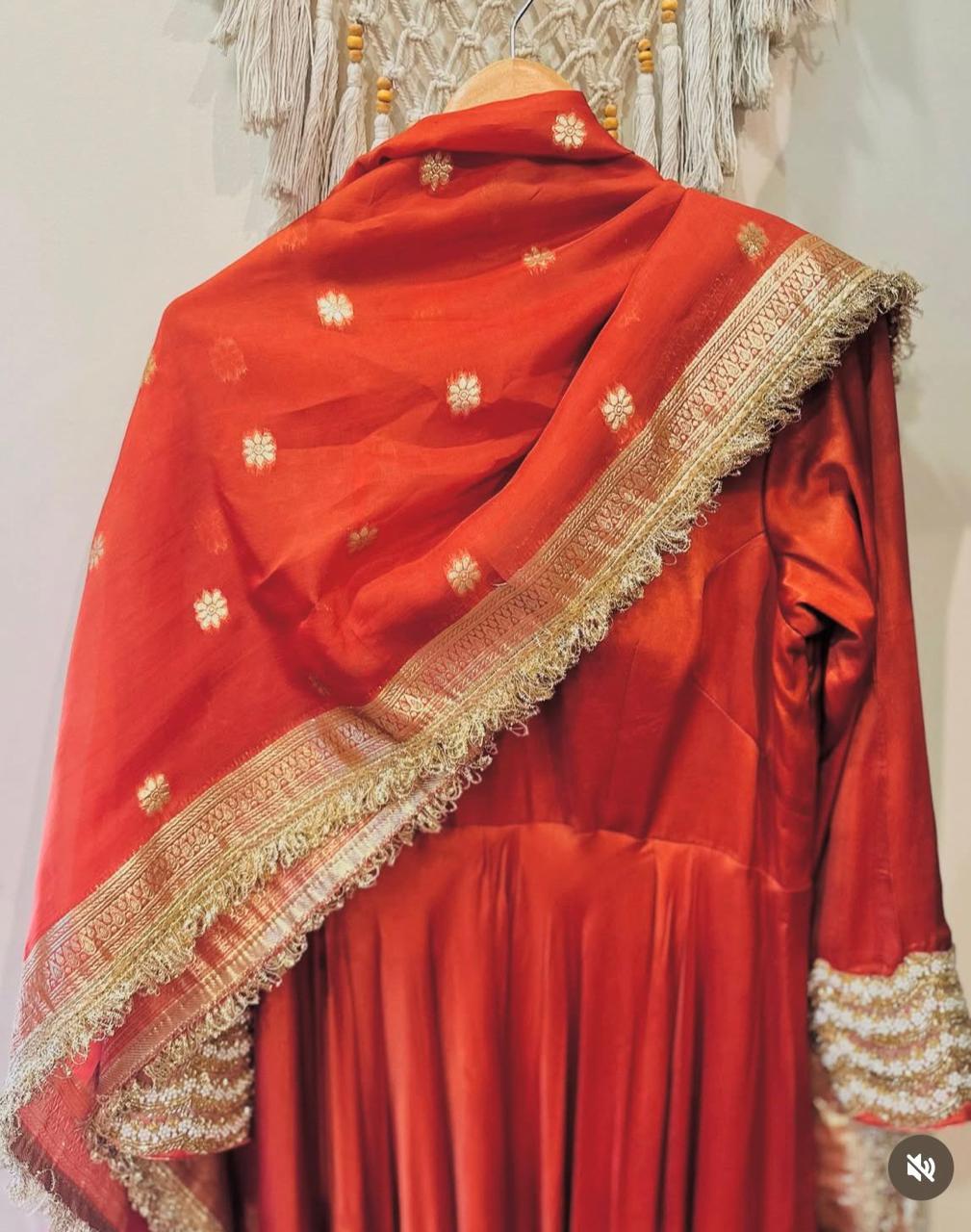 Thisburnt orange Anarkali suit is crafted from luxurious ssatin crepe fabric, designed with a flowy silhouette for effortless elegance. It comes with a richly embroidered cutdana sleeves &organza dupatta featuring golden thread work and delicate embellishments along the border with shera. The combination of bold color and intricate embroidery makes this outfit ideal for weddings, festive gatherings, and special occasions.