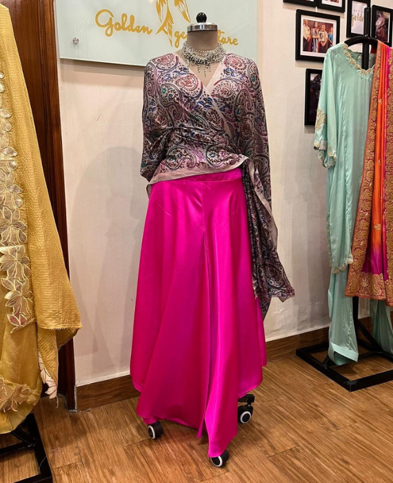 Add a pop of elegance to your festive wardrobe with this paisley print wrap top paired with a vibrant fuchsia flared skirt.